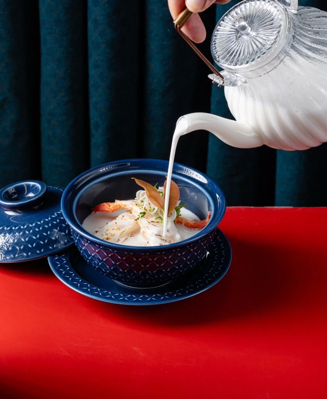Silky tofu and Thai herbs broth with lotus stem, “Bai Cha Muang” leaves, and smoked chili paste.