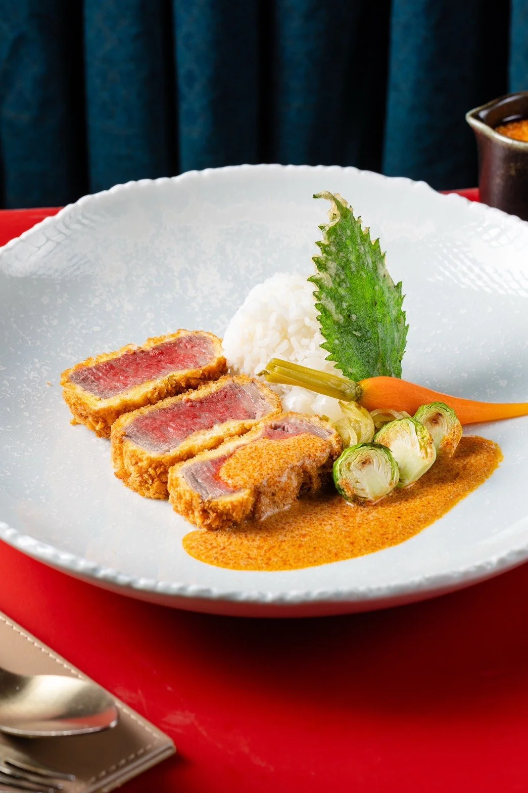 Wagyu gyukatsu, Massaman curry sauce, Thai Northern japanese rice, Pickled baby carrots, and Pickled cucumber