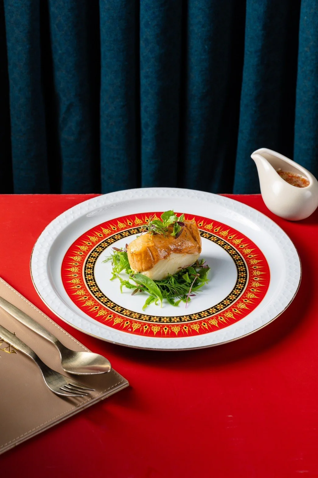 Grilled snow fish topped with red curry knifefish mousse, forest fern shoots, mixed Thai herbs, and seafood sauce