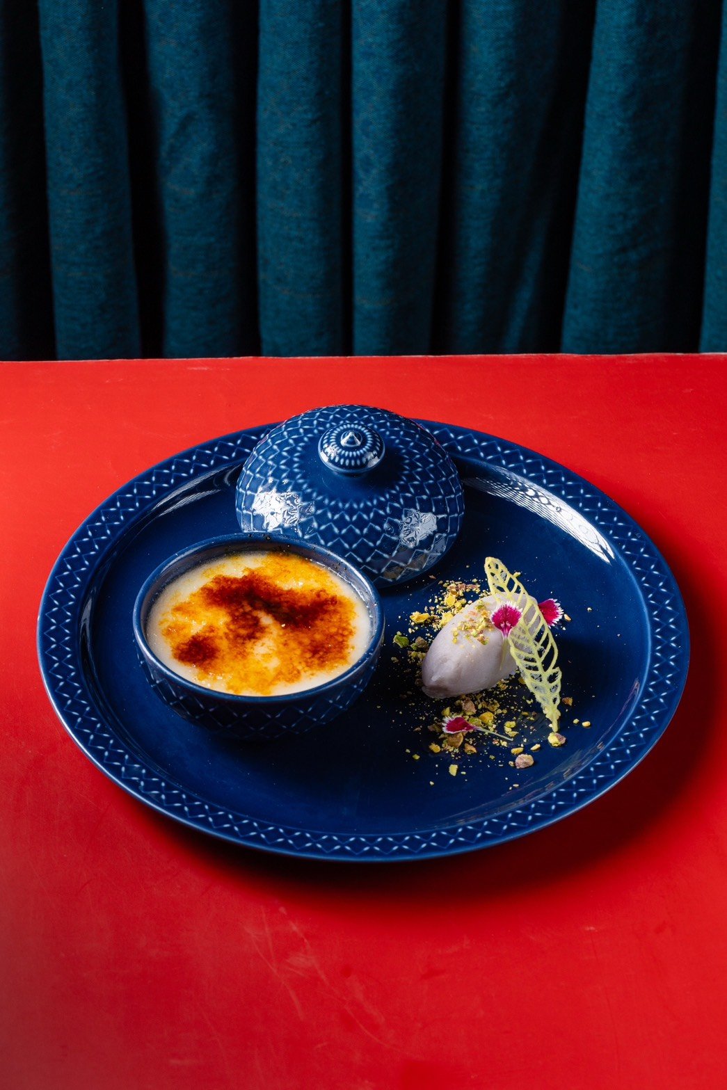 Black sticky rice crème brûlée, longan, fragrant taro ice cream, pistachio, and pandan tuile