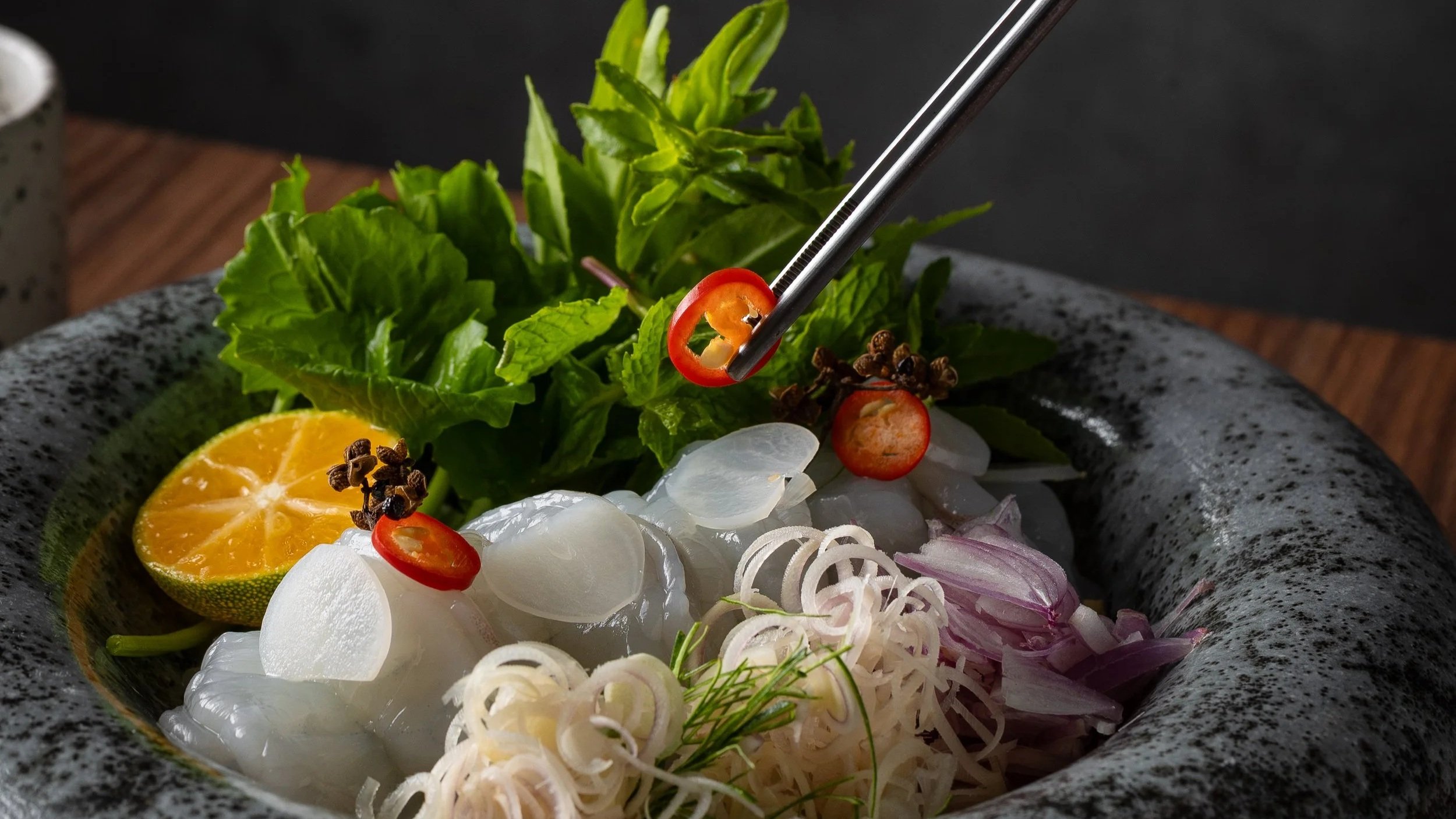 Grilled young coconut “Saeng-Wa” topped with cured cherry tomato, Thai herbs, and aromatic citrus zest.