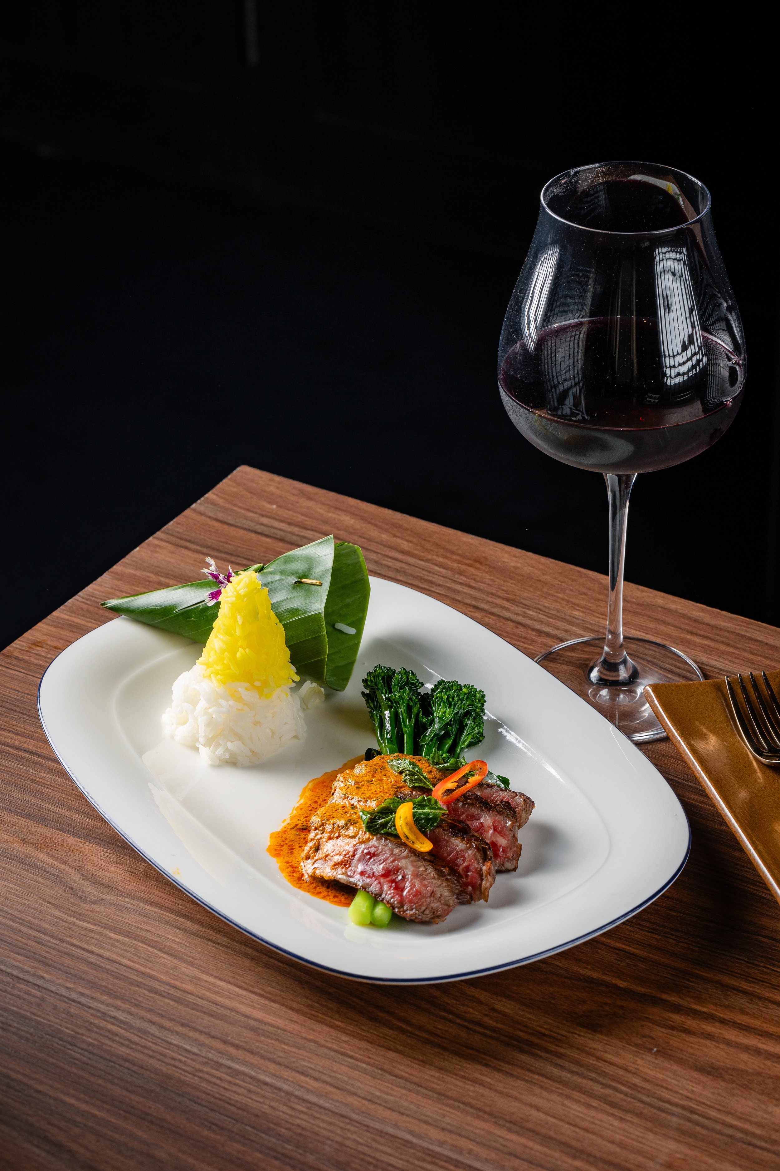 Grilled Wagyu Striploin with Hot Basil Southern Curry topped with Crisp Hot Basil, Broccolini Served with Saffron Jasmine Rice