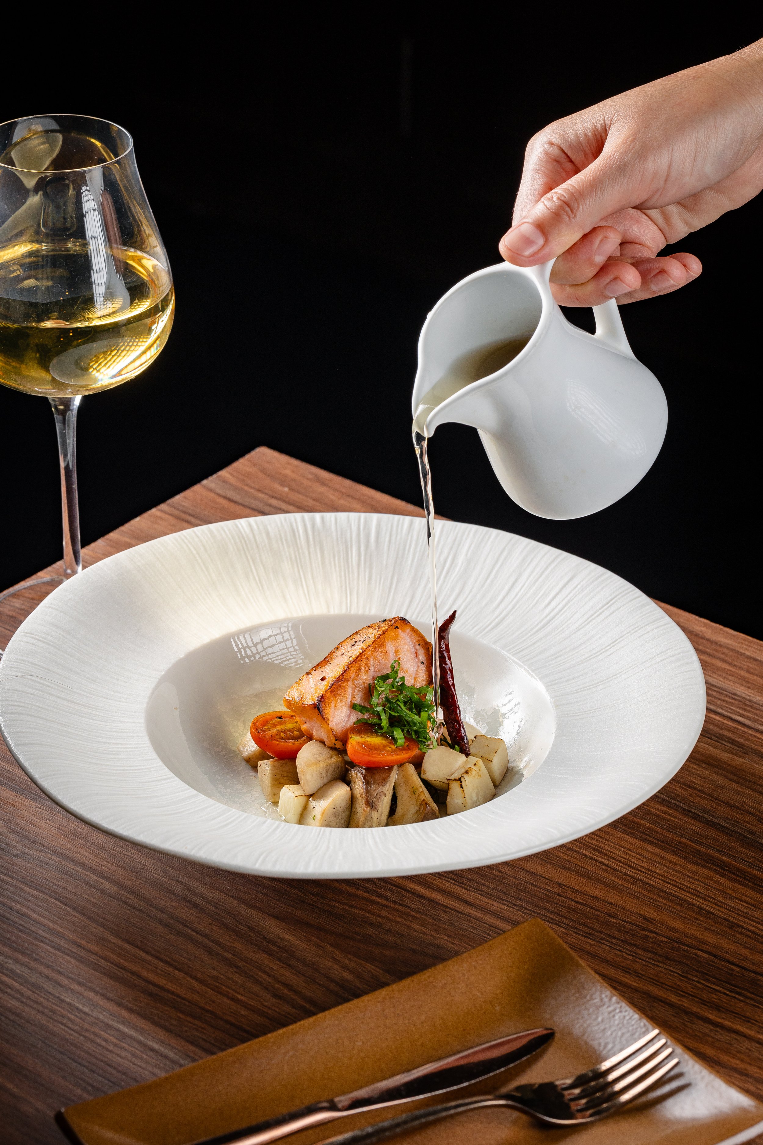 Grilled Salmon in Clear Smoked Herbal Broth