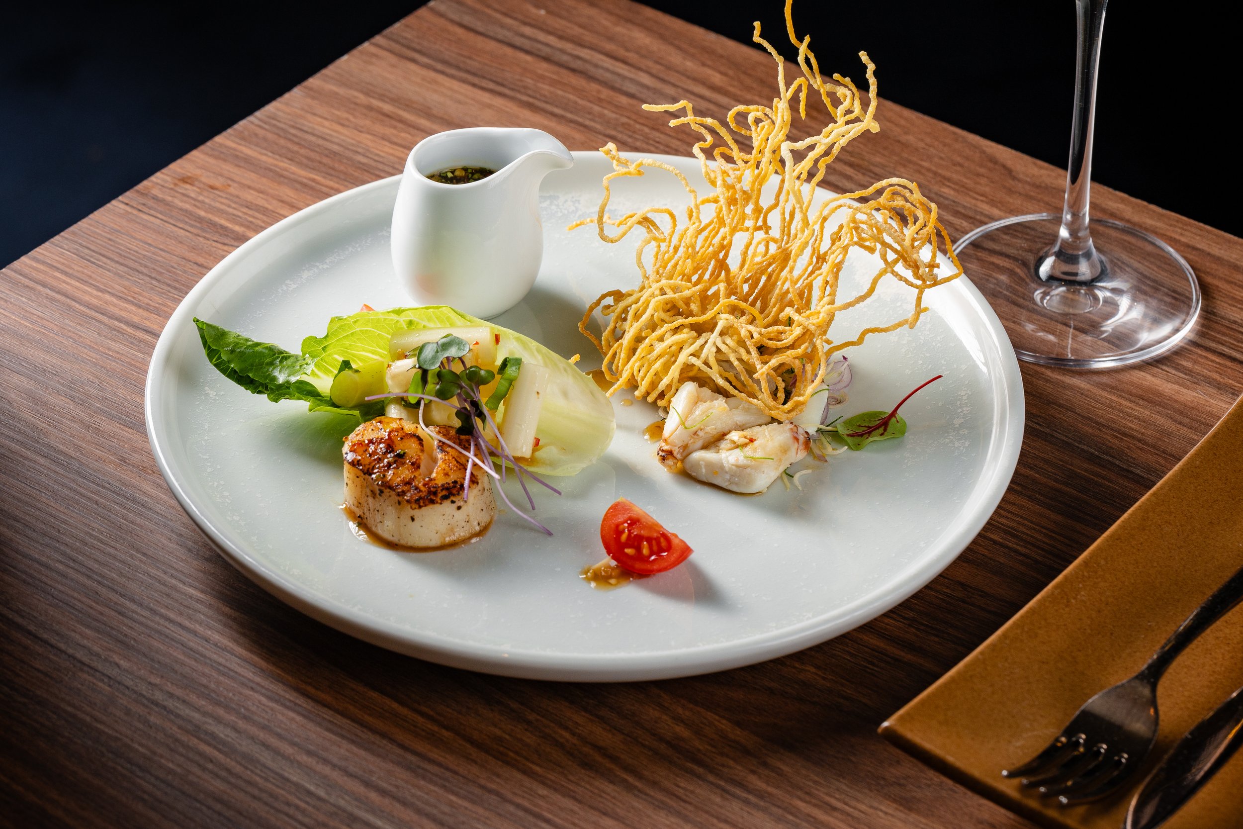 Seared Scallop with Lotus Stem Salad, and Cherry Tomatoes