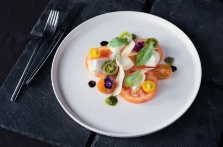 Variety of Locally Grown Organic Tomatoes, Balsamic Reduction, Genovese Pesto, Buffalo Mozzarella