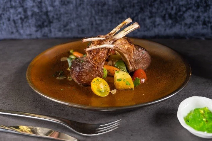 Poached and seared Tiger Prawn Tails, Roasted Peppers Emulsion, Fondant Potato, Bok Choy, Chili Jam, Mango Salsa