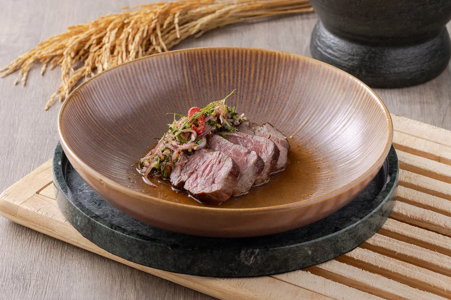 Grilled Beef Tenderloin, Roasted Rice, Tamarind–Chili Dressing, Herbs, Celery, Tomato, Red Onion