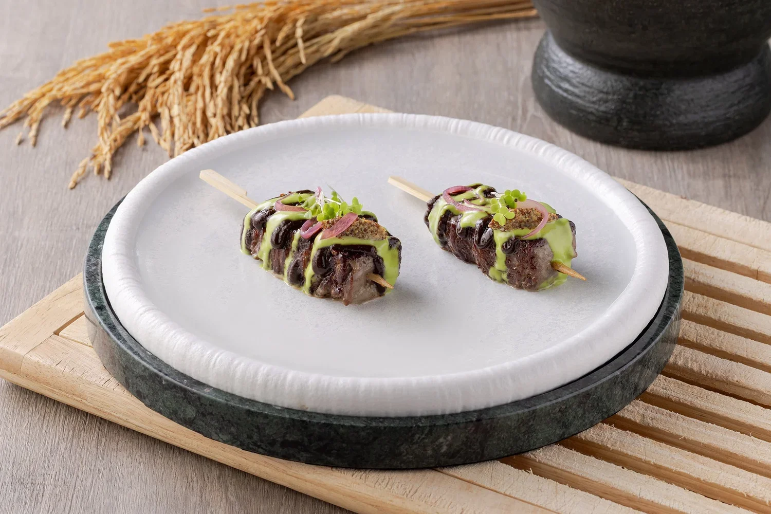 Beef Skewer with Black Garlic, Chive Emulsion,