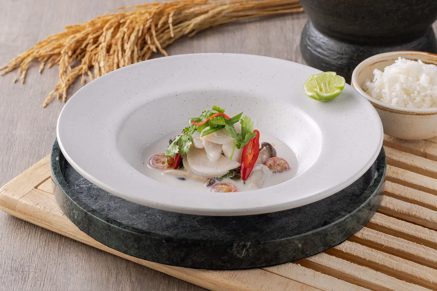 Young Coconut Shoots, Baegu Leaves, Mushrooms, Tomato, and Galangal