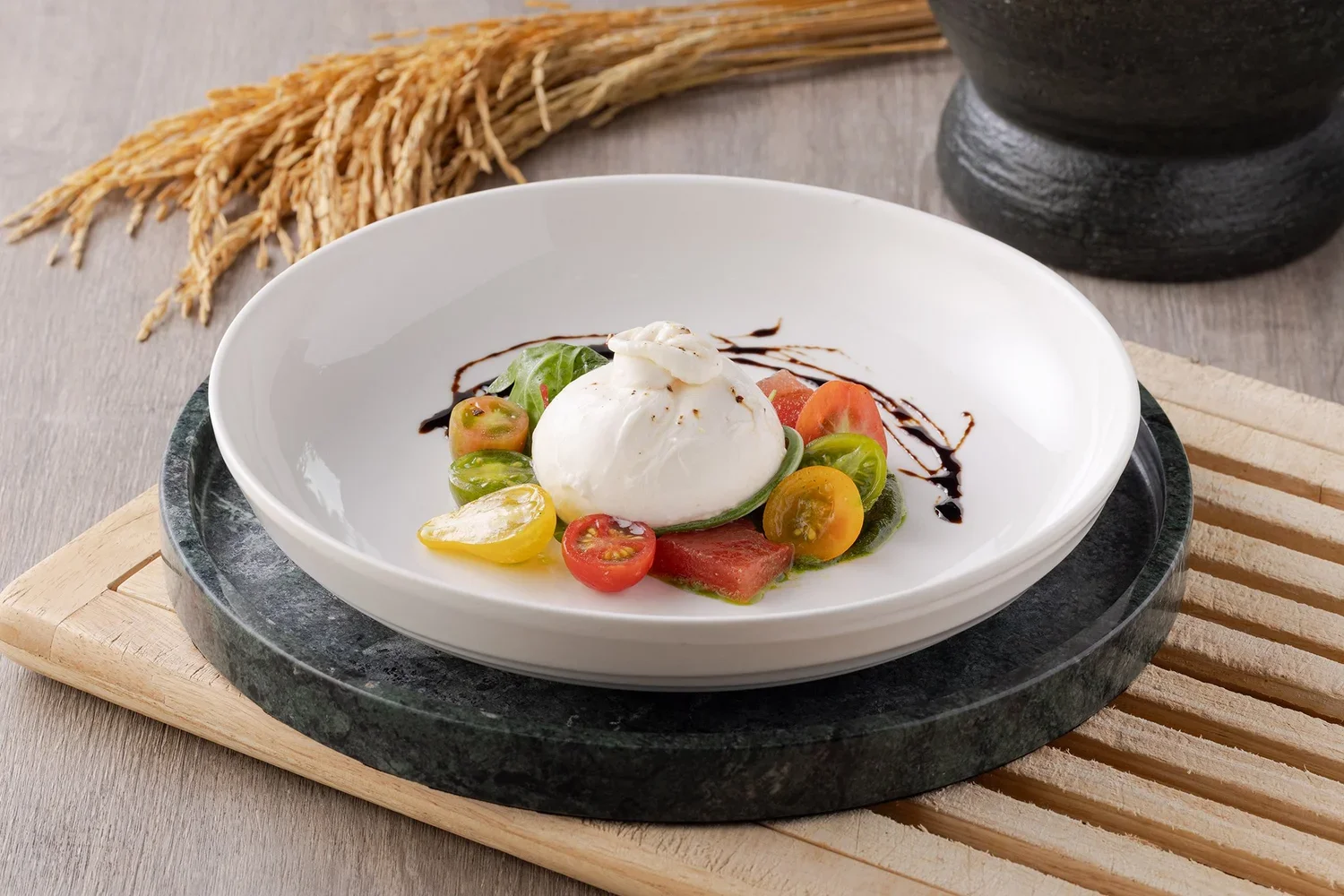Burrata Cheese, Compressed Watermelon, Rocket, Balsamic, Pesto, Fancy Tomato