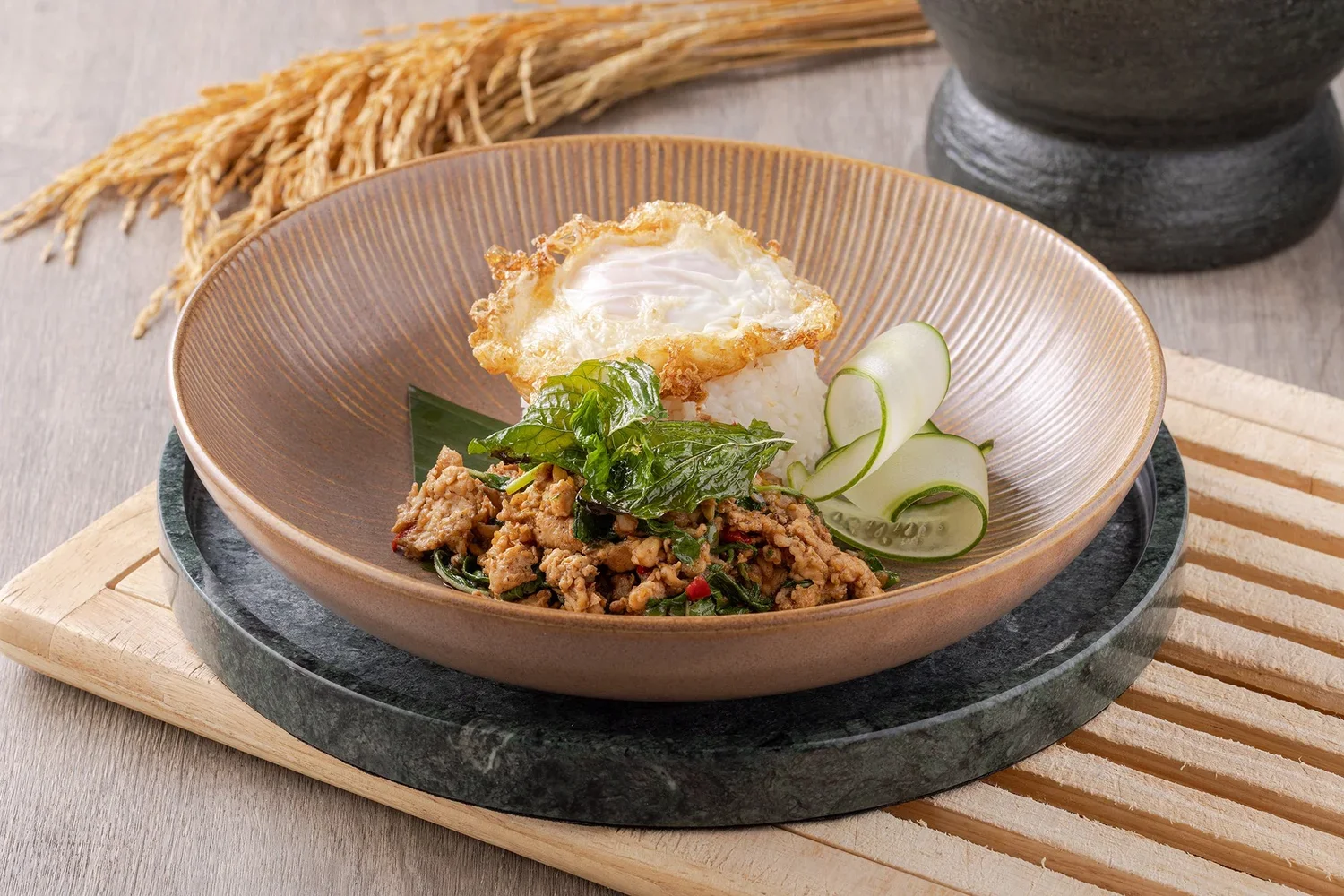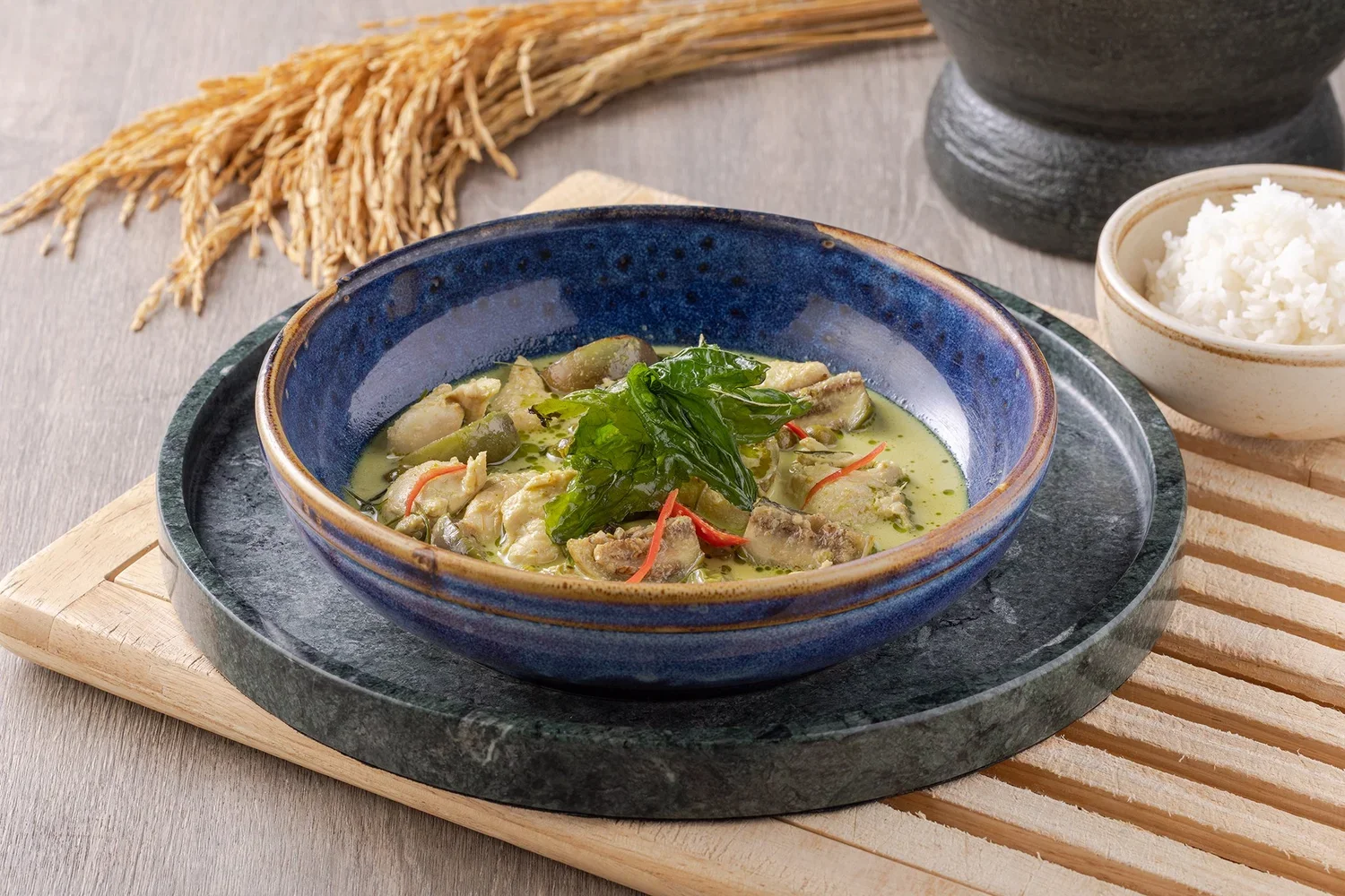 Thai Green Curry with Chicken, Coconut Milk, Eggplant, Sweet Basil, and Kaffir Lime Oil