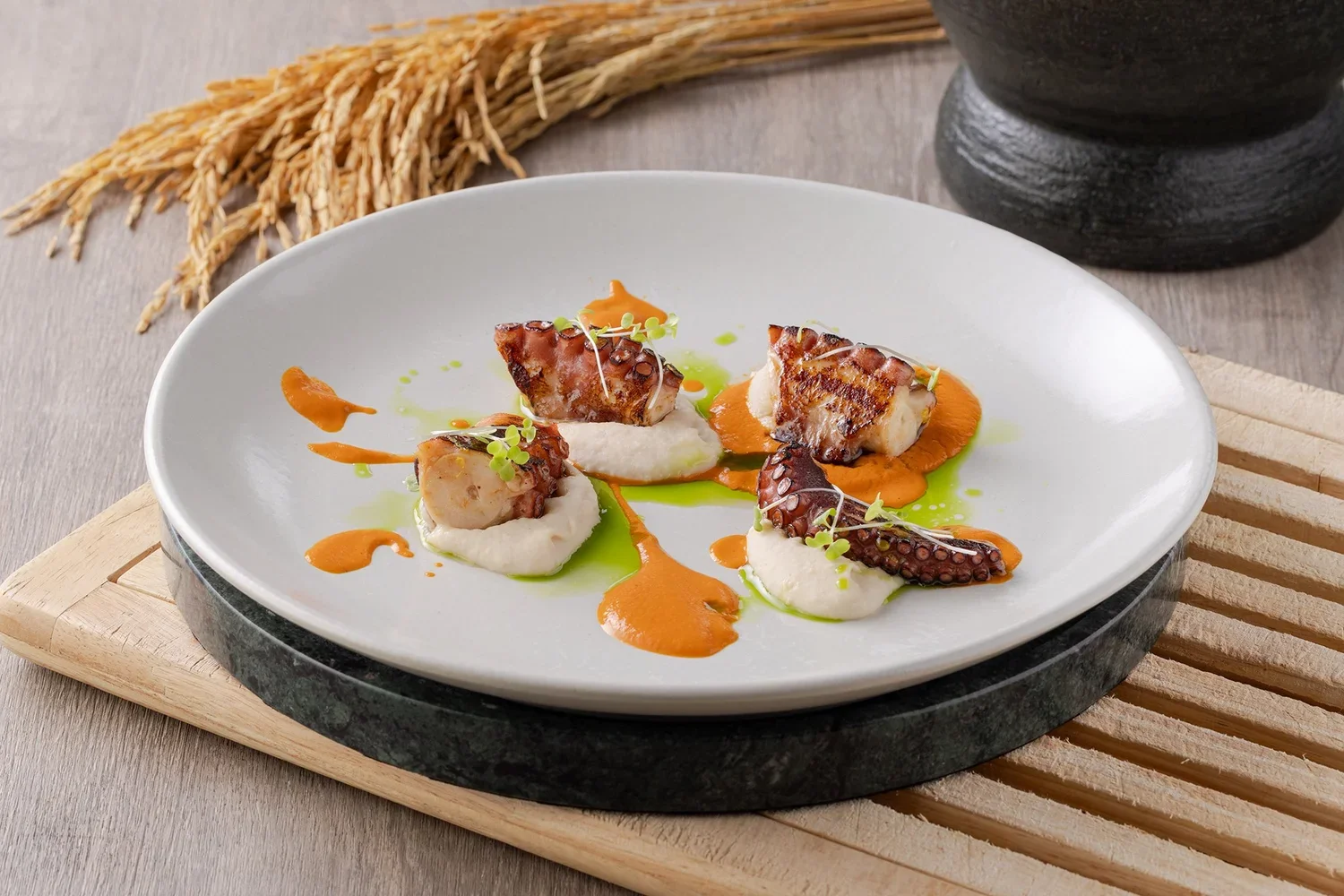 Grilled Octopus, White Bean Purée, Herb Oil,
