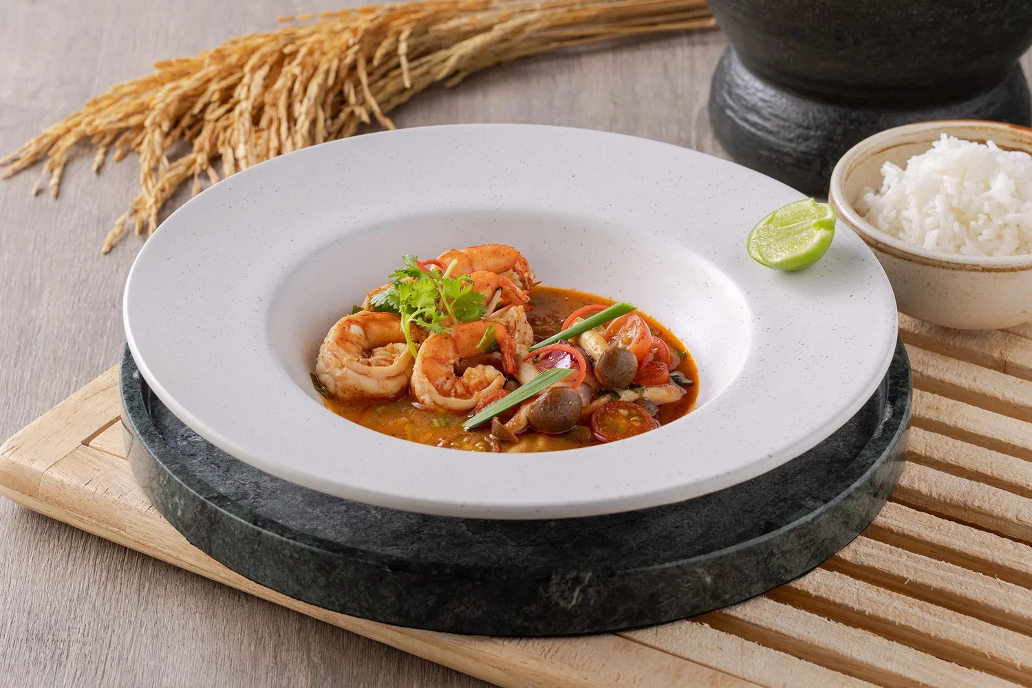 Hot And Sour Lemongrass Soup with Prawns, Herbs, Chili Paste, and Coconut Milk