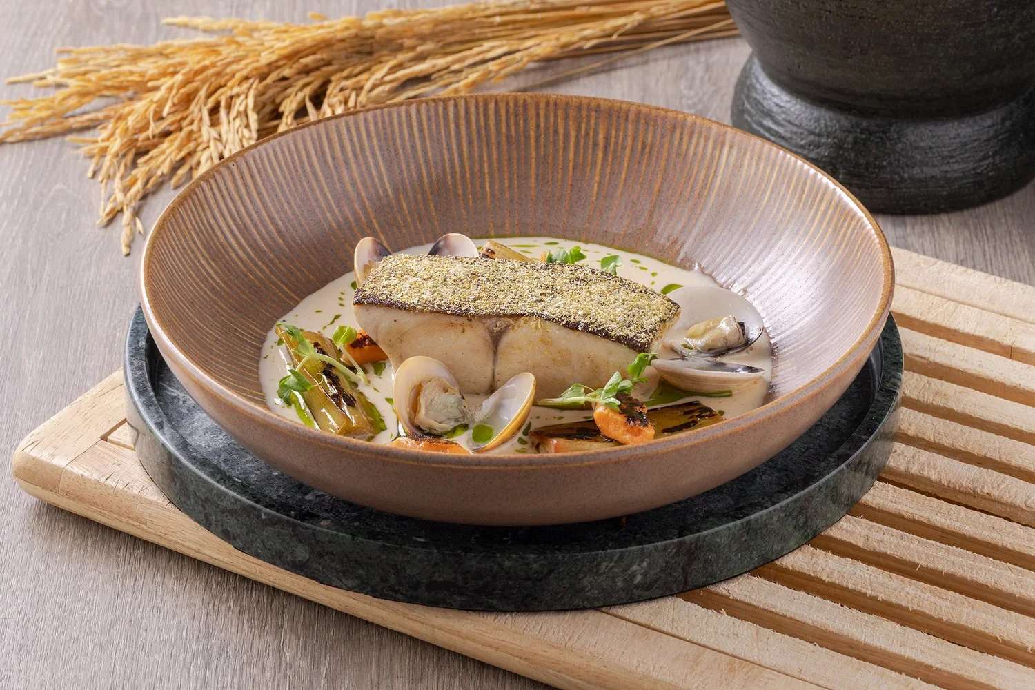 Pan-Roasted Black Cod Embraces with Grilled Krabi Lobster Tail, Local Baegu Leaves,