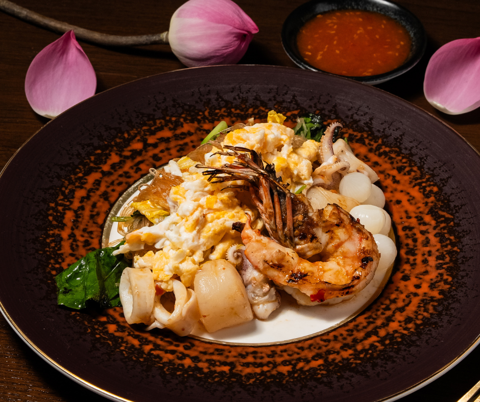 วุ้นเส้นผัดกับผักอาหารทะเลต่างๆจากทะเลอันดามันใส่ไข่ออแกนิกกับซอสสุกี้รสจัดจ้าน