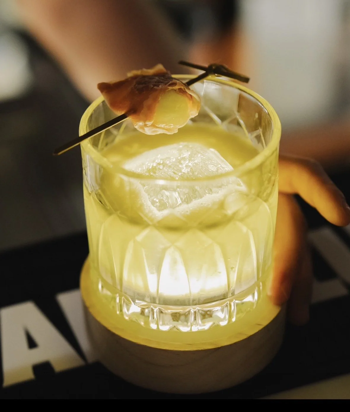 Fat-Wash Gin (Beefeater 24), Midori, Melon Juice, Balsamic & Honey, Lime Juice with Coppa Ham Rolling with Melon