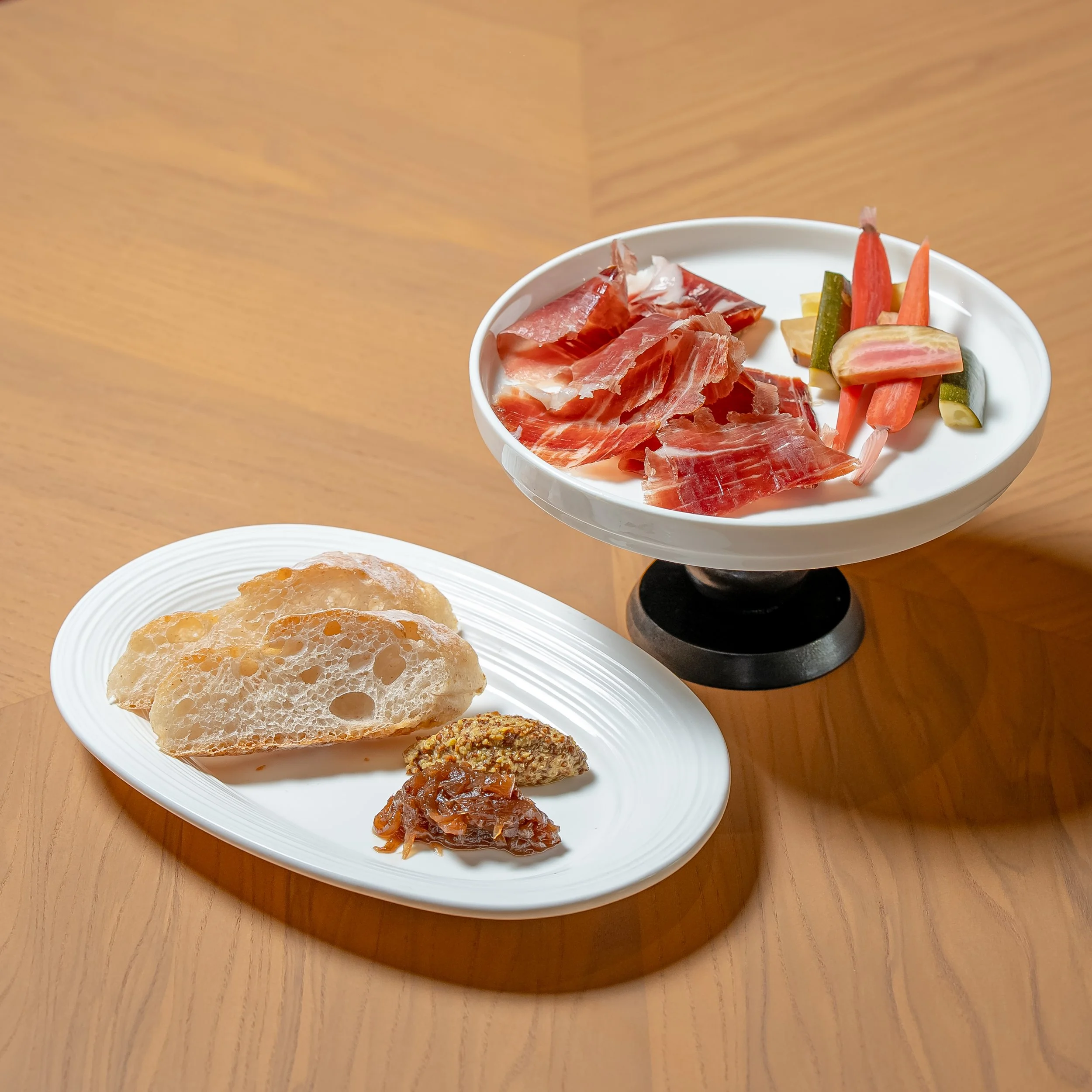 50 grams per serving, accompanied by baguette, mustard, pickles and onion jam