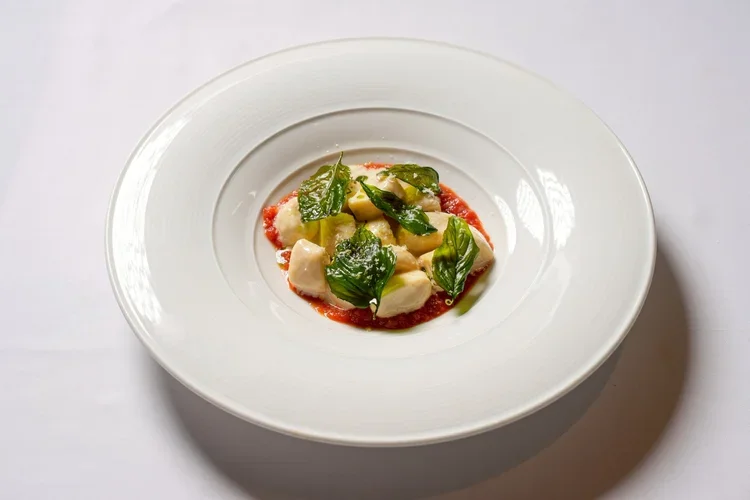意大利乳清干酪面疙瘩,古冈左拉奶油,番茄酱,罗勒