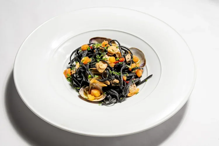 墨鱼汁扁面,蛤蜊,白葡萄酒,酸面包屑