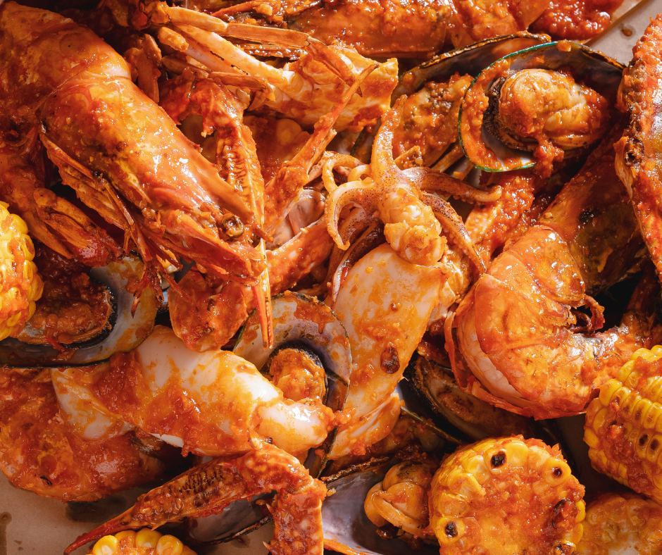 Our signature “Seafood Feast” features a premium selection of succulent king prawn, New Zealand mussels, calamari and blue crab. All tossed in our secret Cajun Butter Sauce with sweet corn.