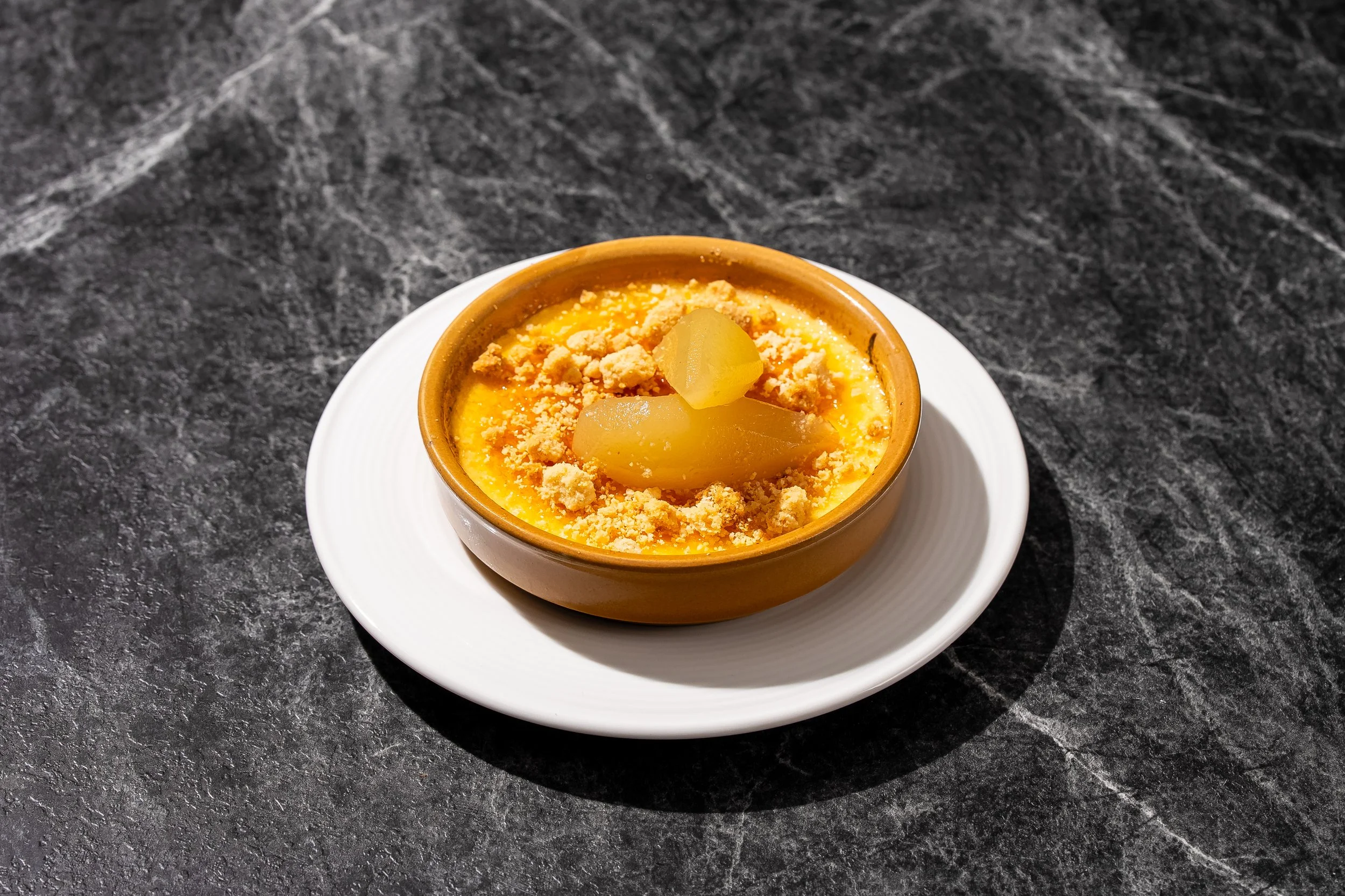Crema Catalana, Poached Pear, Almond Crumble