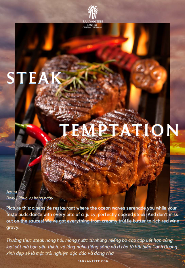 Azura là nhà hàng biển đặc trưng của Banyan Tree, với khu vực ngồi cho khách thoải mái trong nhà và gần gũi với thiên nhiên ngoài trời. Cùng một thiết kế bếp mở với lò nướng đốt củi truyền thống, nơi các đầu bếp của chúng tôi chế biến những chiếc bánh pizza giòn thủ công thơm ngon nhất. Tận hưởng khung cảnh và âm thanh của sóng biển chỉ cách bạn vài mét khi dùng bữa với các món khai vị ngon miệng, tốt cho sức khỏe, hải sản tươi sống và các món ăn lấy cảm hứng từ vùng Địa Trung Hải.