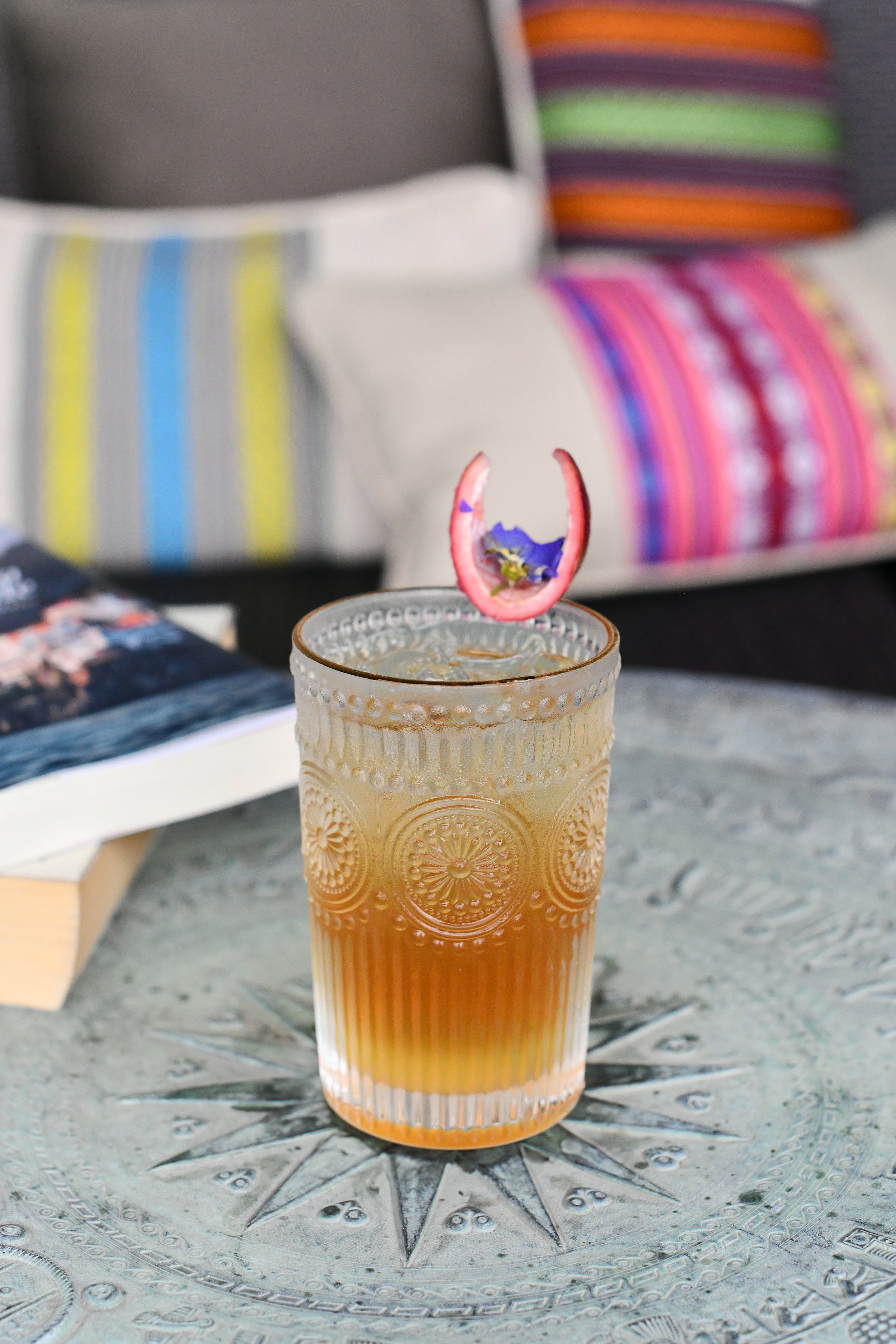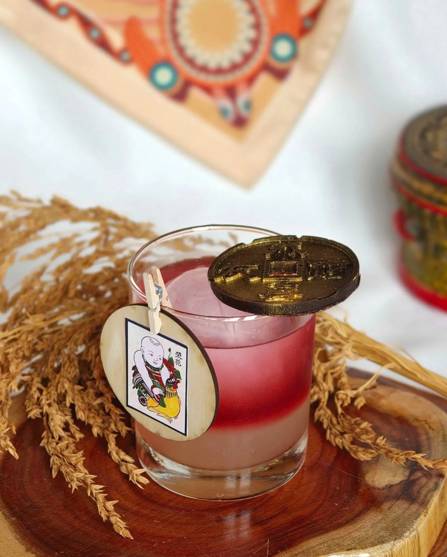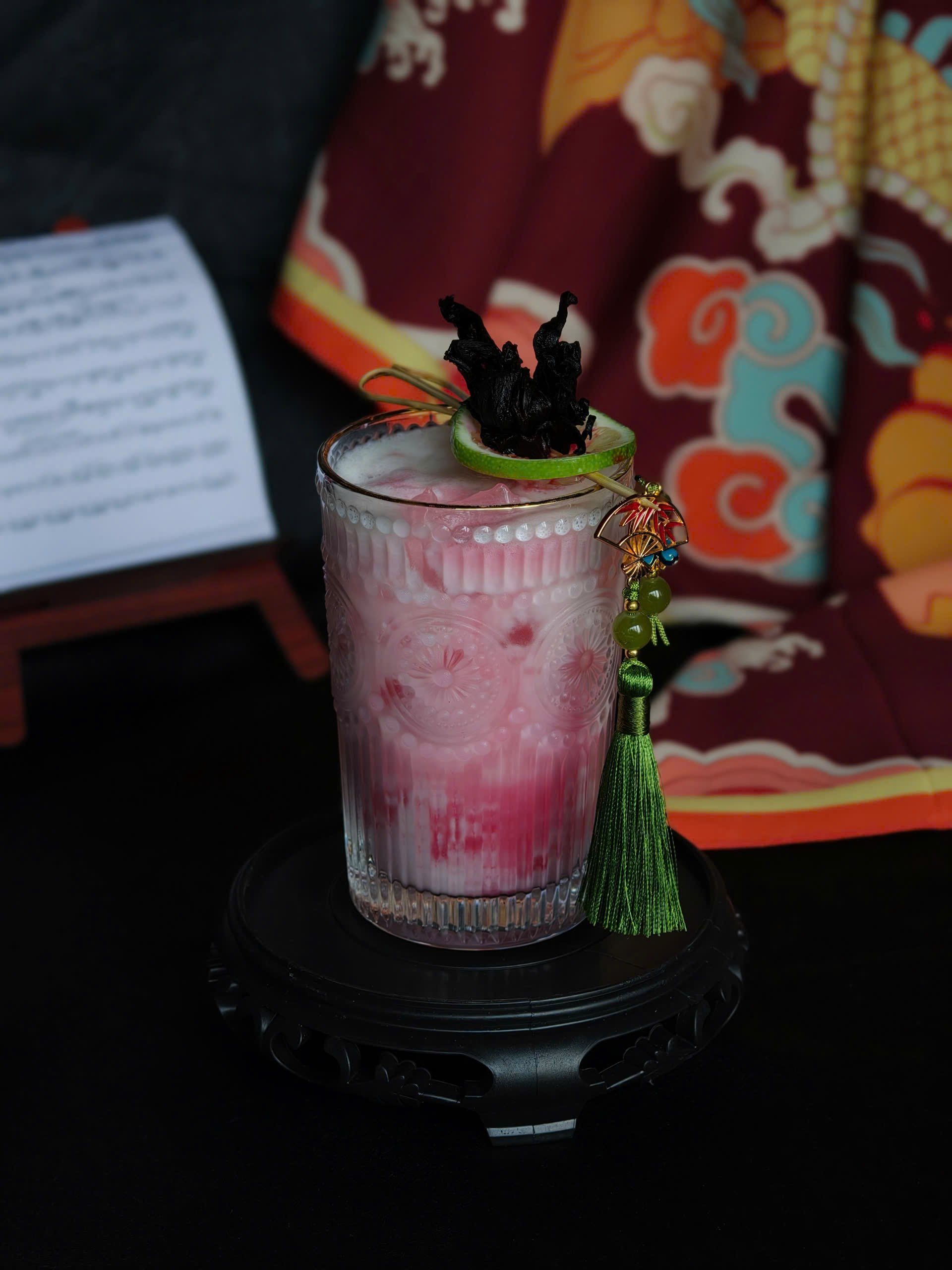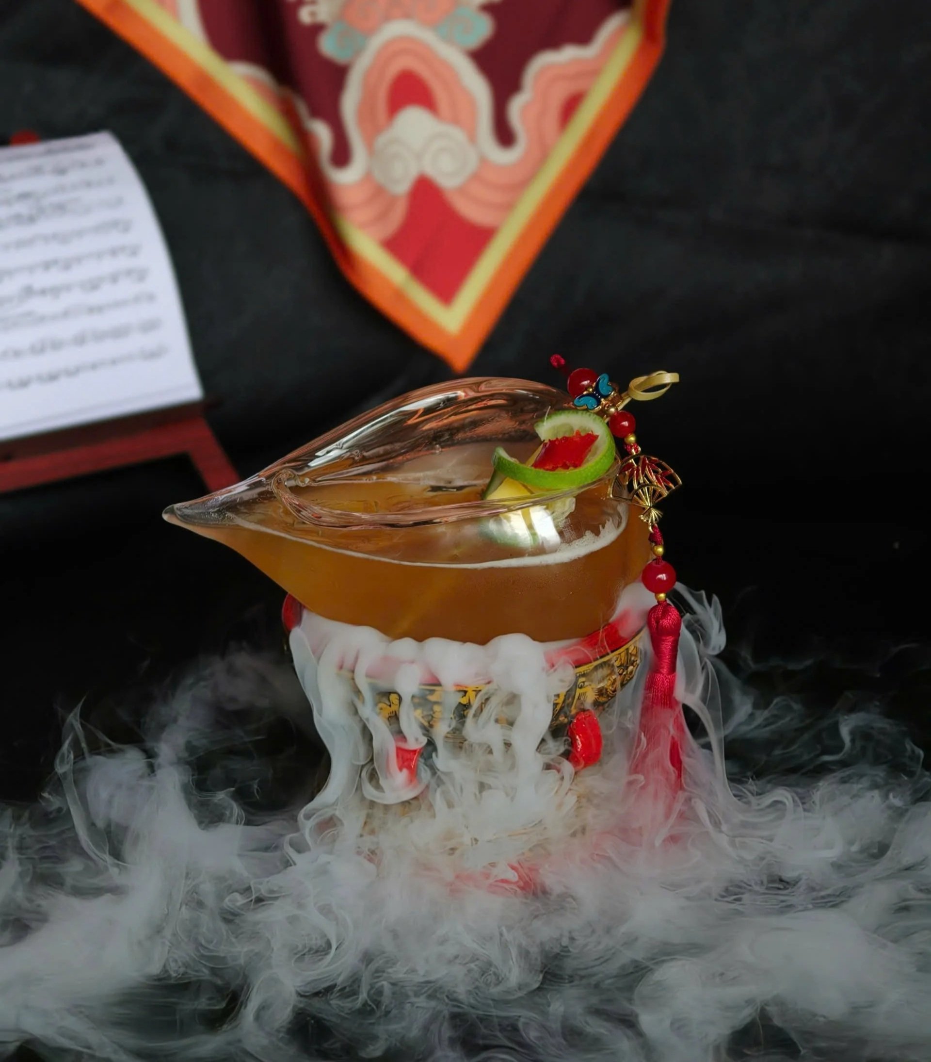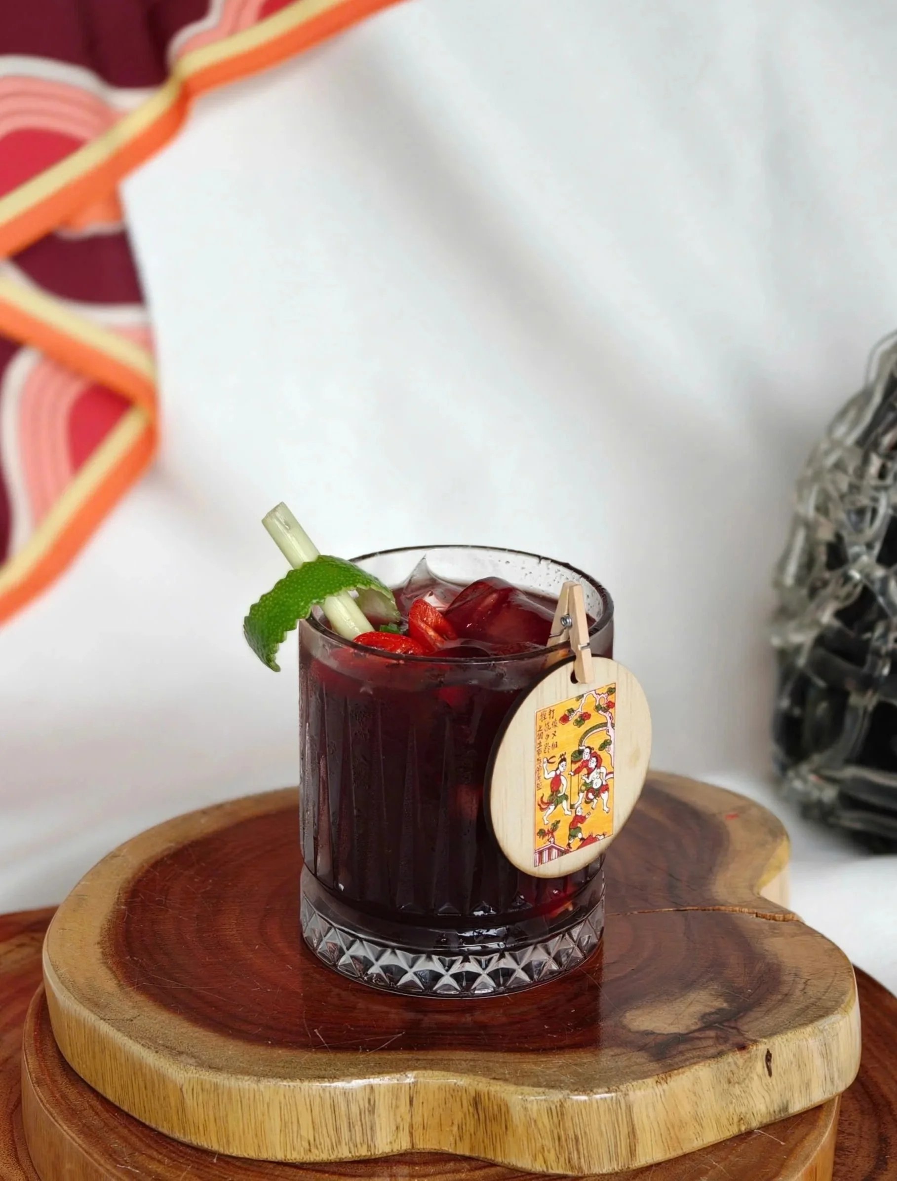 Lotus infused Vodka Men, Mango infused Sampan Rhum, Lime Juice, Pineapple Juice, Hibiscus Syrup, Lemongrass, Passion Fruit, Chilli Sauce, Soya Sauce, Shrimp Salt