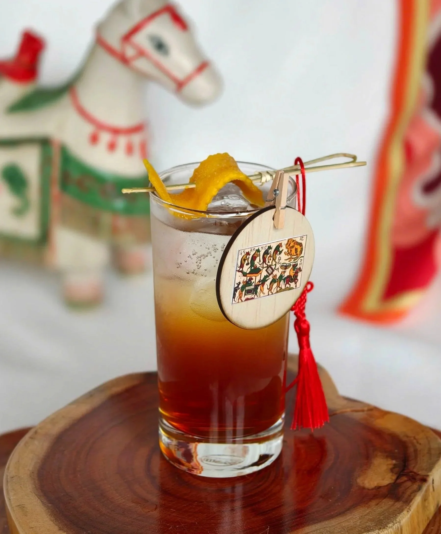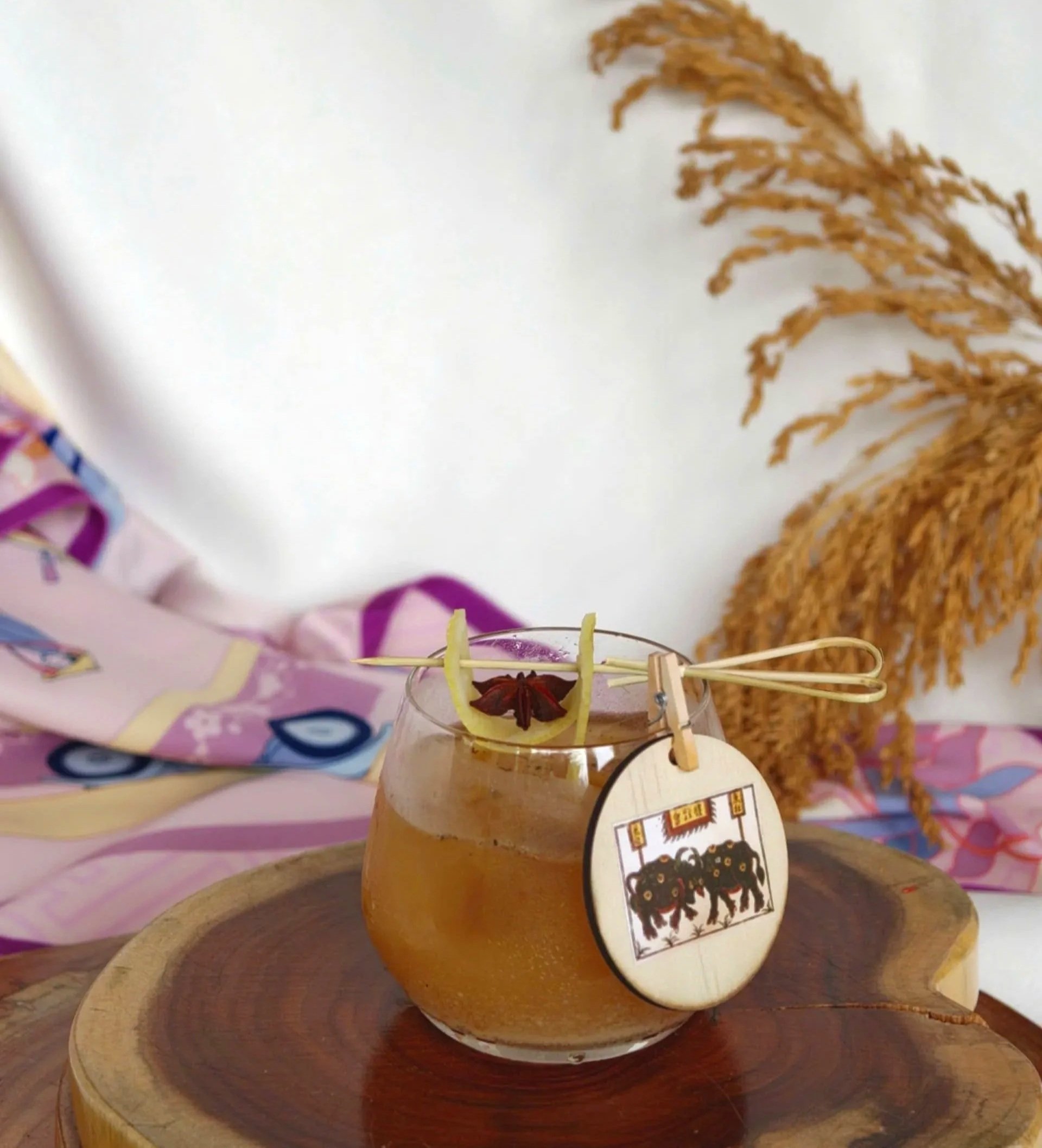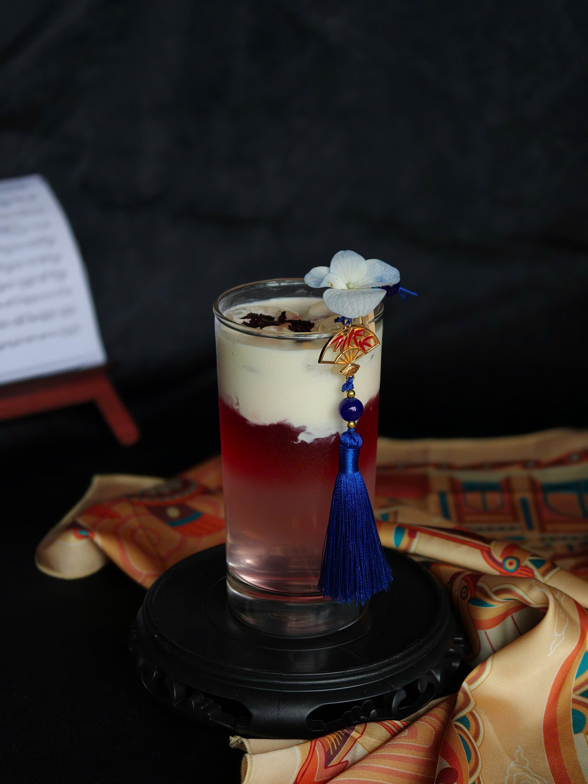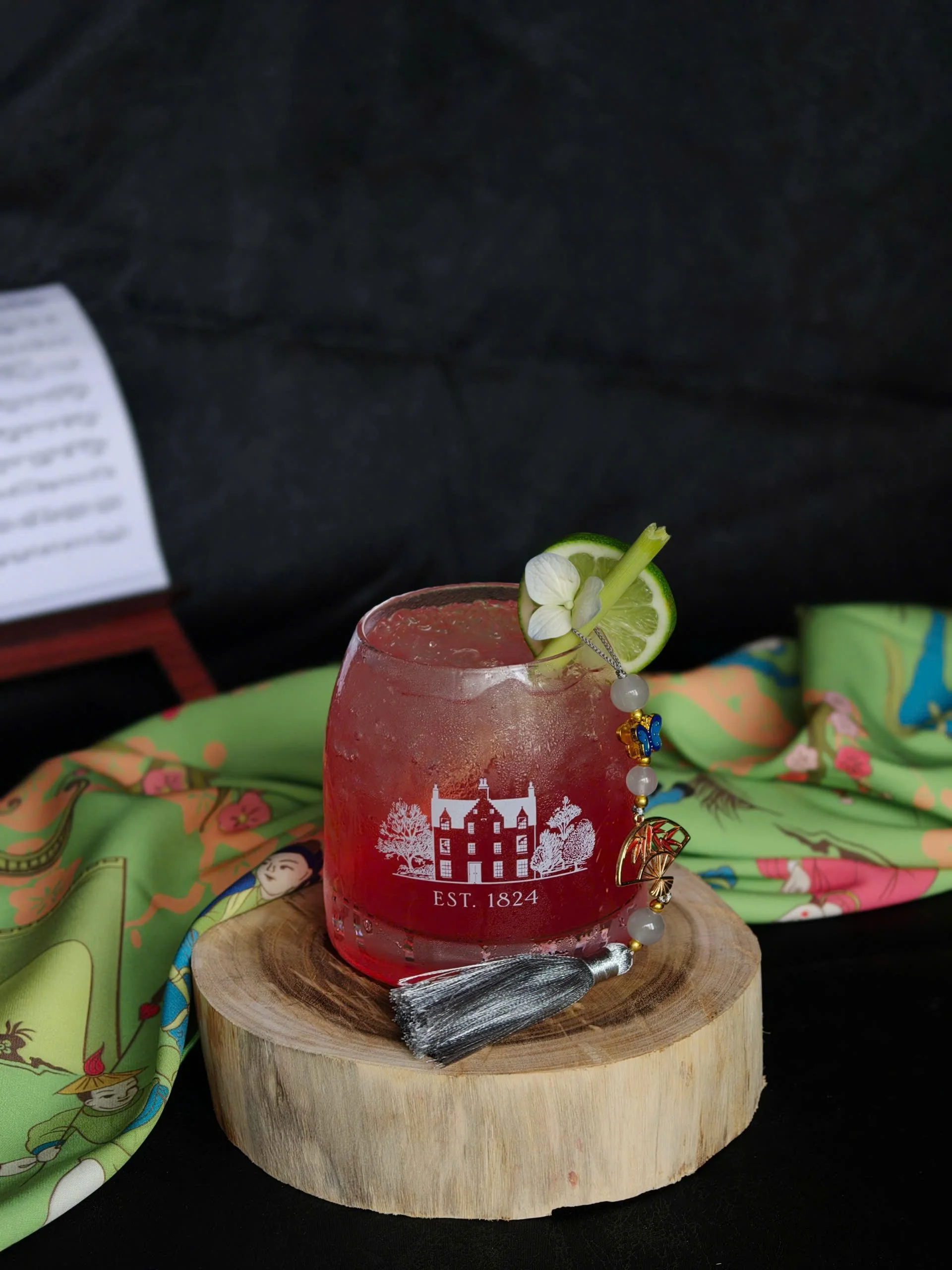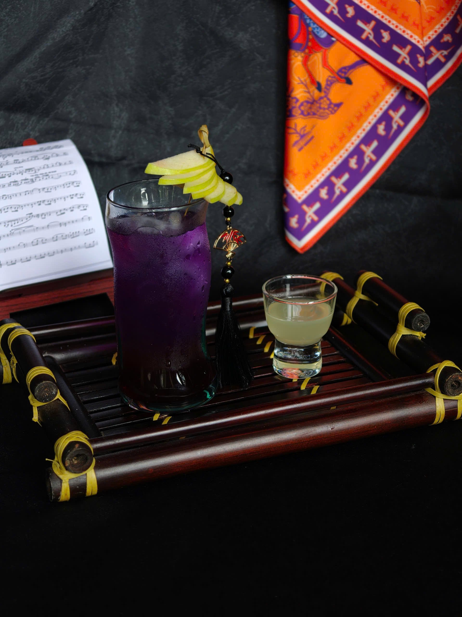 Lotus infused Vodka Men, Mango infused Sampan Rhum, Lime Juice, Pineapple Juice, Hibiscus Syrup, Lemongrass, Passion Fruit, Chilli Sauce, Soya Sauce, Shrimp Salt