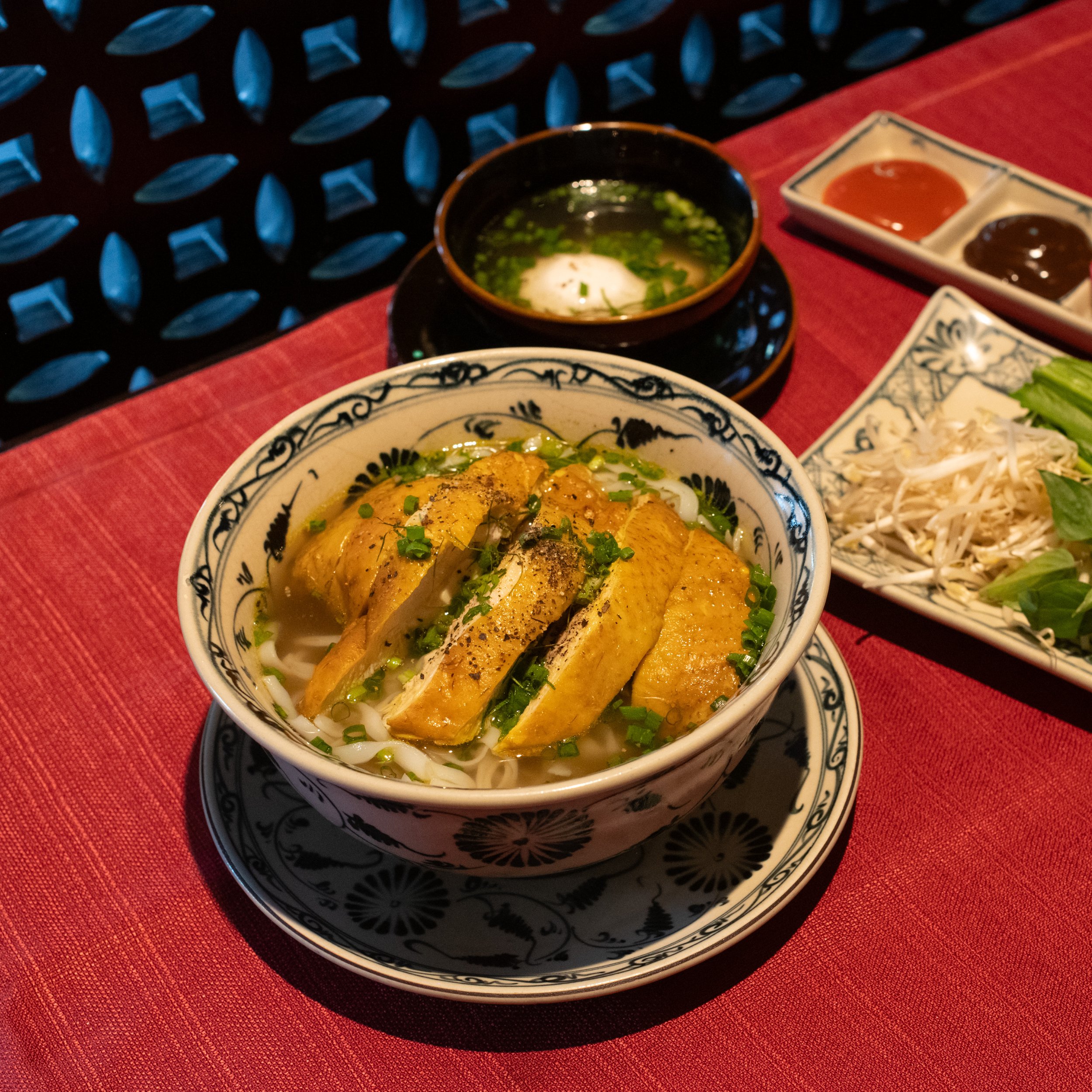 Served with fresh herbs, bean sprouts, lime, chili, pickled garlic, and poached egg