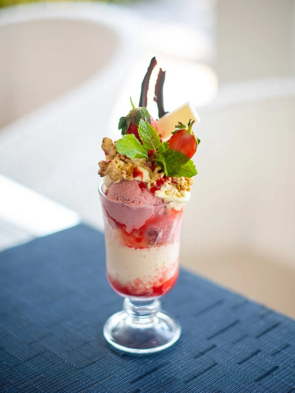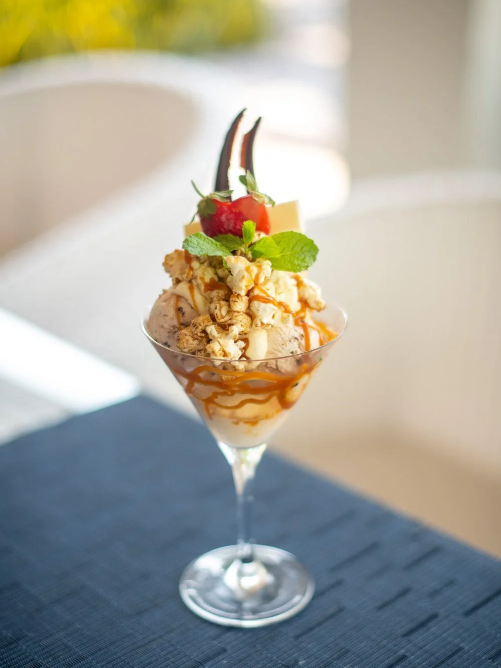 Vanilla bean ice cream, sweet cinnamon popcorn, berries, and fresh Chantilly cream topped. Fresh strawberry and raspberry ice creams with gooey berry syrup.