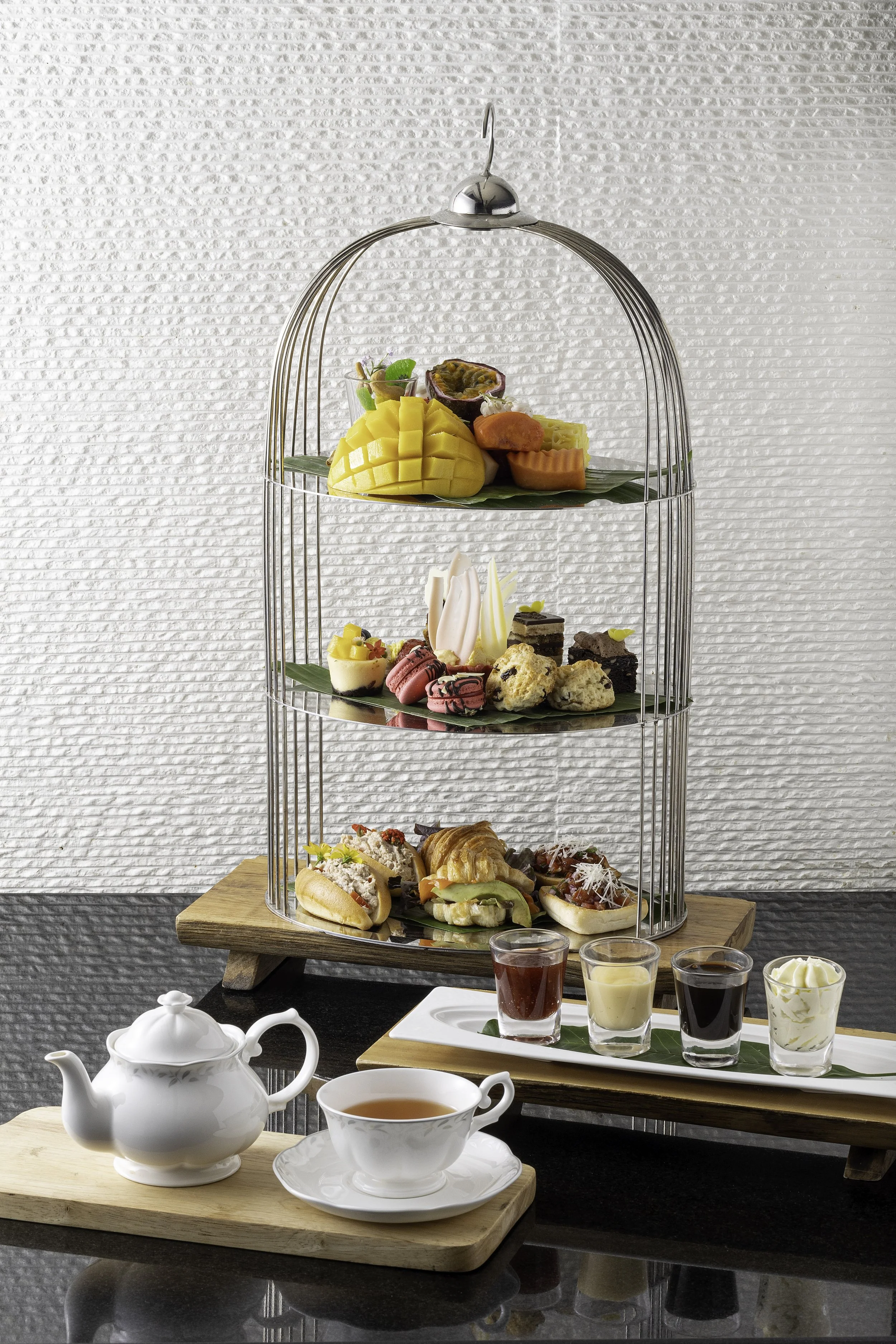 Traditional English Sliced Tropical Fresh Fruits and Dried Fruits Opera Cake, Macaroons, Brownie Cake, Honey Comb Cake, Cheese Cake with Mango Coulis,