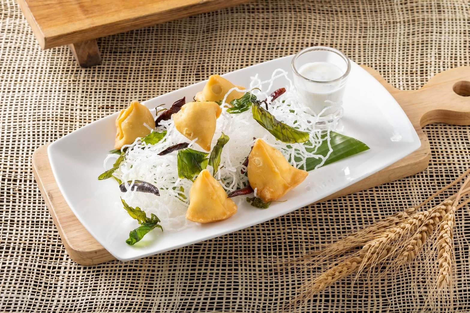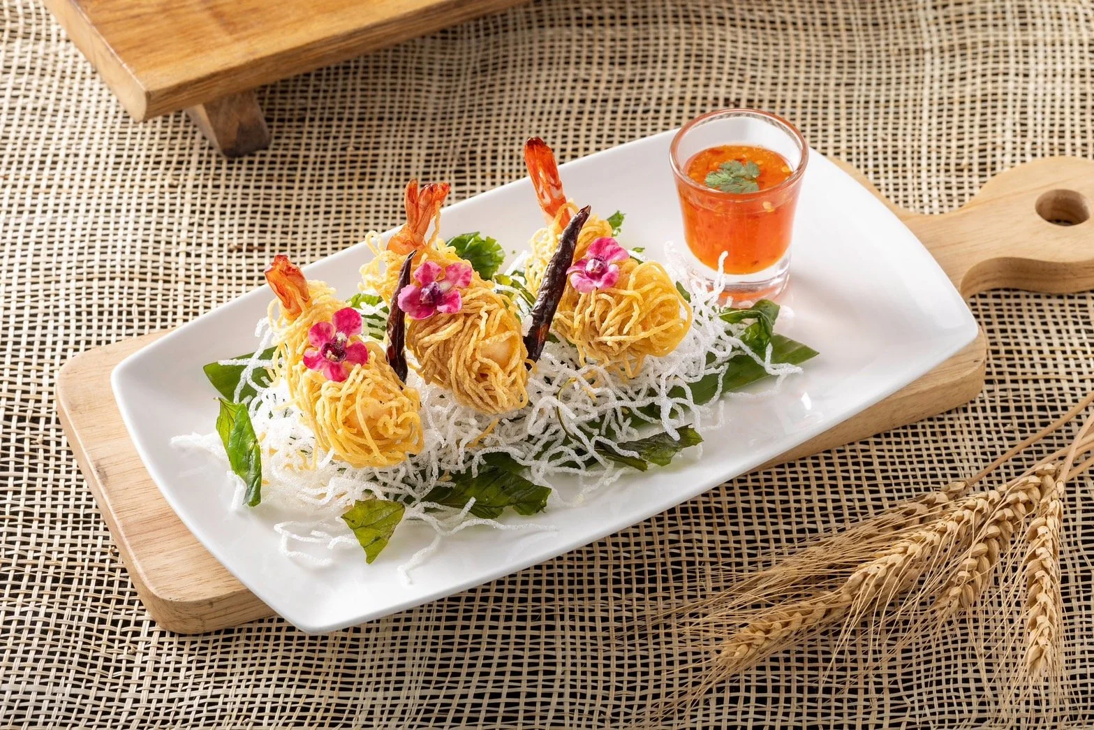 Deep-fried Shrimps in Golden Egg-noodle Crust, Sweet Chili and Plum Sauce
