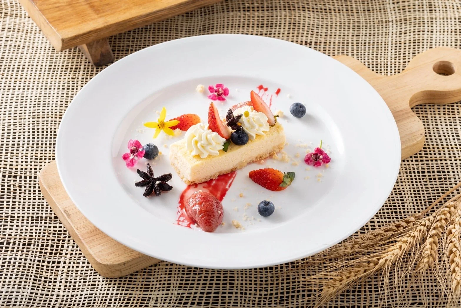 German baked Cheese Cake, Strawberry compote, Pistachio dust