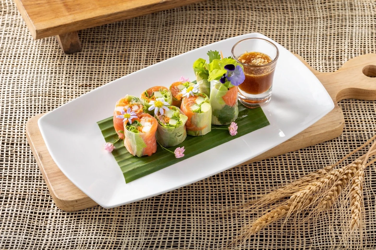 Rice Paper-Wrapped Smoke Salmon and Vegetables Rolls