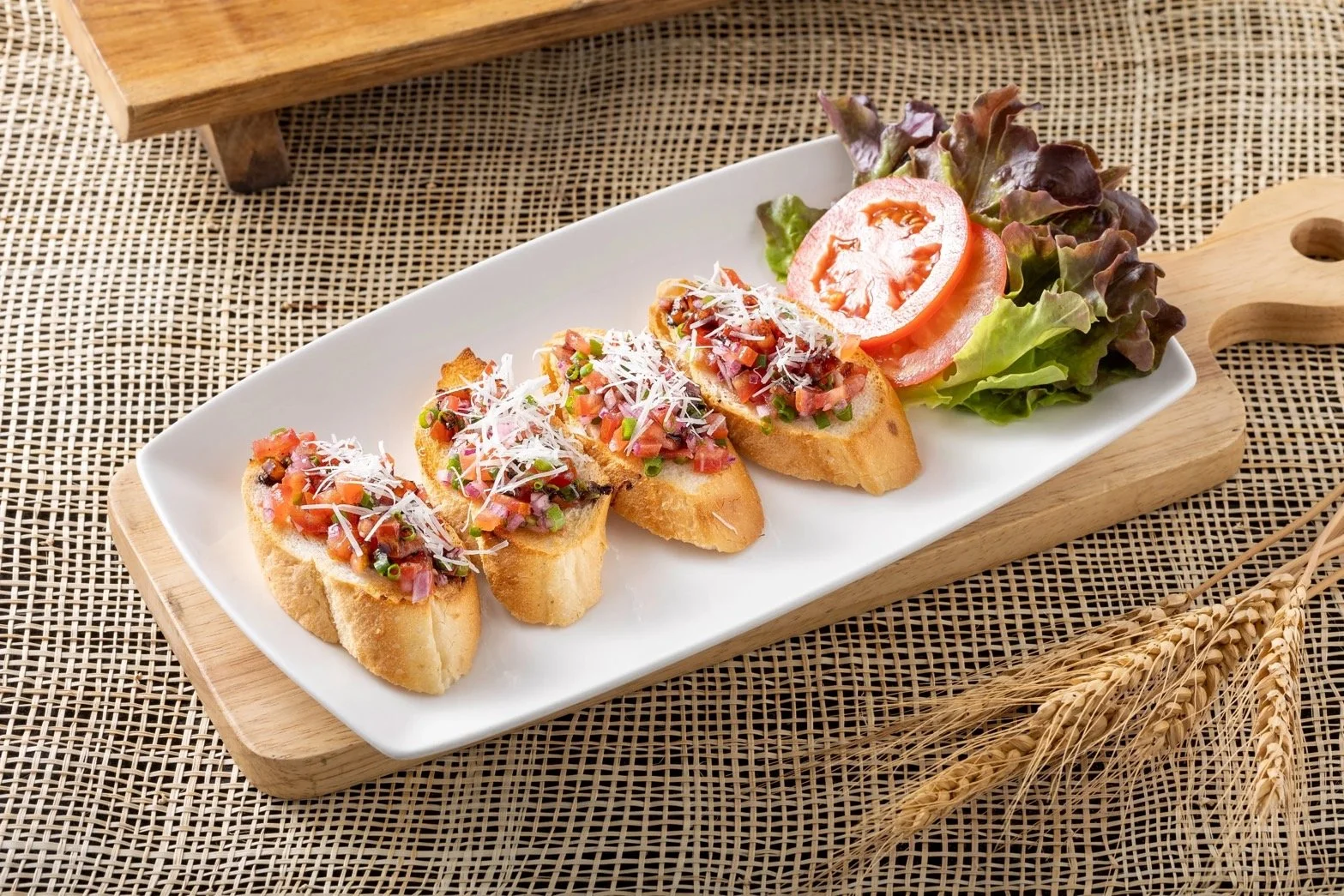 Toasted Bruschetta Infused with Garlic Served with Aged Parmesan Cheese, Ripe Tomatoes and Virgin Olive Oil